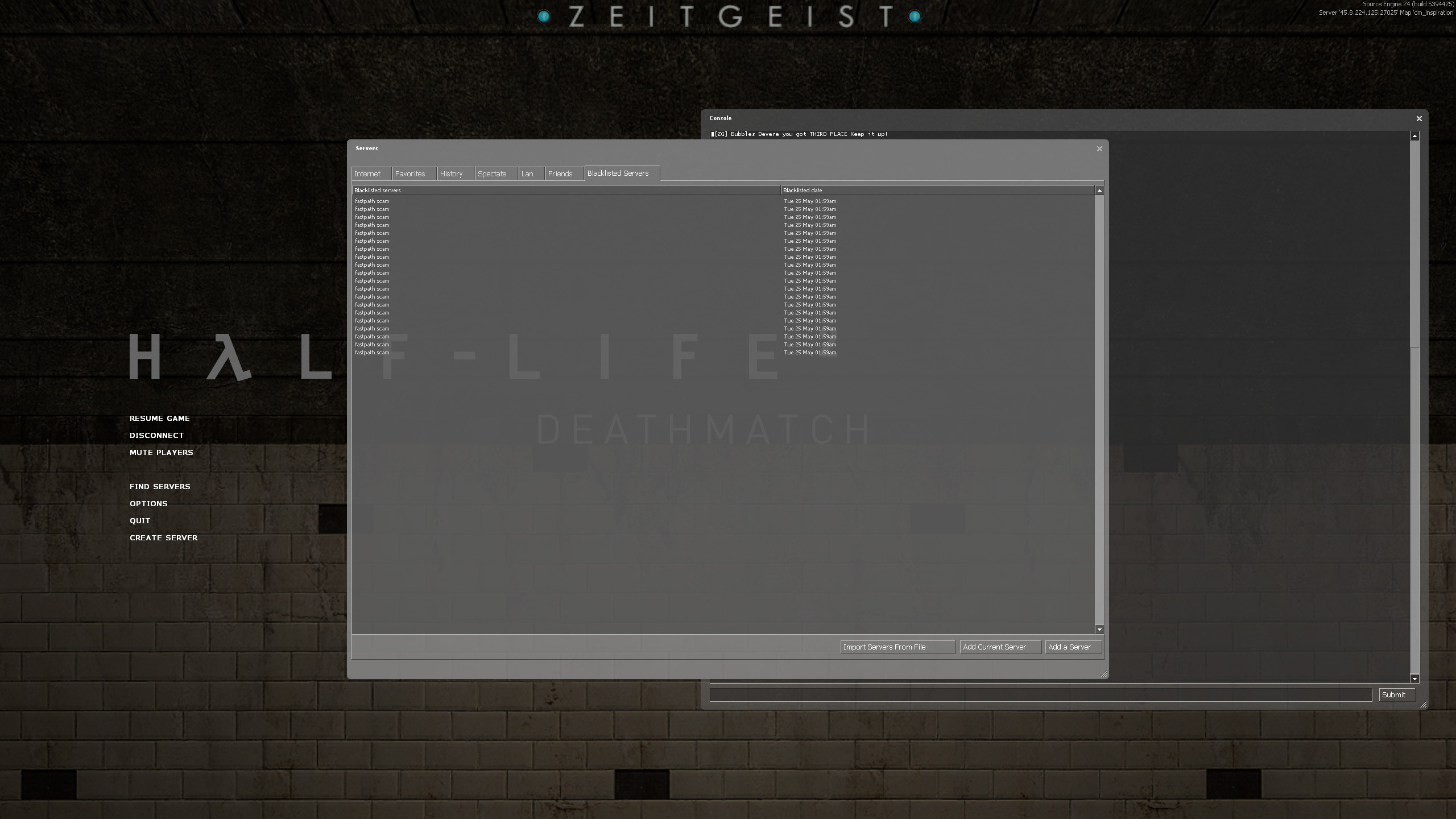 Hey everyone,I like to browse the server browser and check out new servers from time to time. I get quite annoyed by these fake server names which all forward you to back fastpath.fr servers against your will.Therefore I have created a blacklist for all the Fastpath servers known to date. I will try and update this as more get added.To use it, download the zip file and extract server_blacklist.txtFor HL2DM:Open hl2dm > open the server browser > open Blacklist Servers tab > click "Import Servers From File" > Select server_blacklist2023.txt which you exported earlier.For Blackmesa:Close BlackmesaGo to C:\Program Files (x86)\Steam\steamapps\common\Black Mesa\bms\cfgPaste the server_blacklist2023.txt file in that folder.Say Yes if asked to replace.Hope this helps!Cheers,Bubbleswww.zgeist.eu