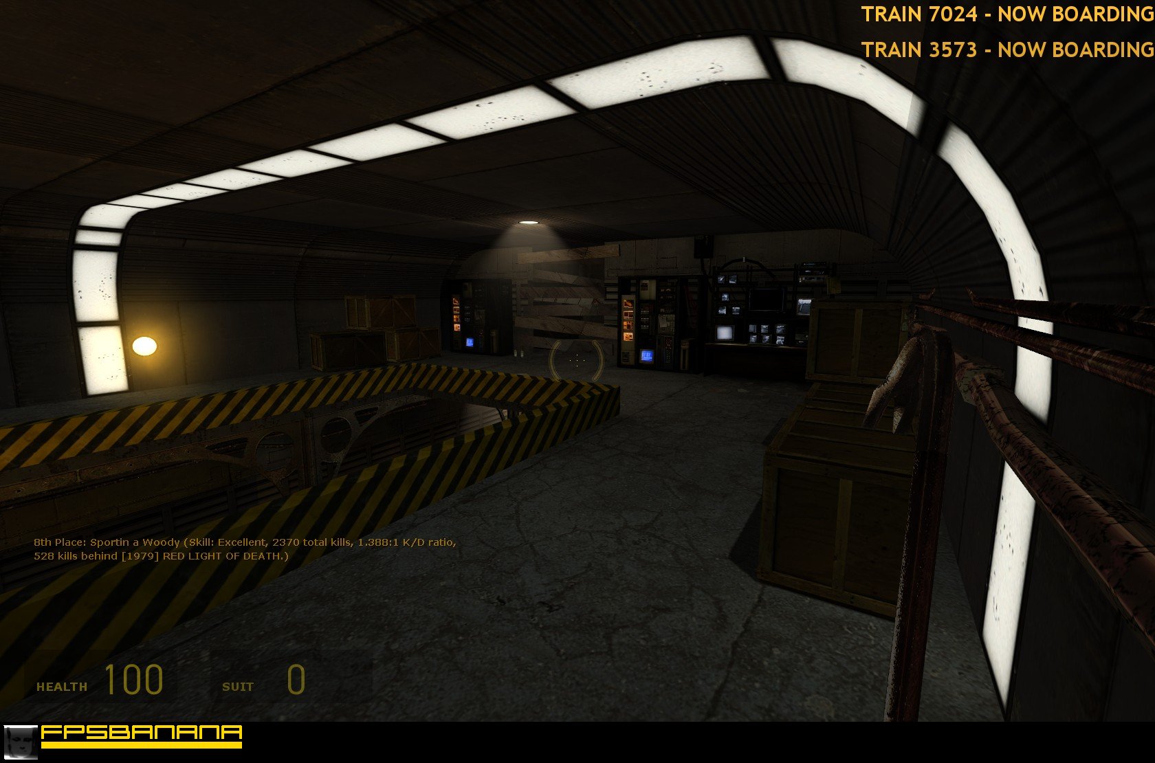 This map features two trains that run independently of one another at about 70 MPH--each at a slightly different speed to ensure that their behavior isn't boring or predictable. It's possible to ride the train by hopping on one of the flat cars at a terminal, or ride *ontop* of the train cars using a nearby railing or falling down onto it from above. The map is even designed for train-to-train drive-by fighting in some sections. Plenty of traps, easter eggs, hidden vents and tunnels, and detailed entity work make this map a real scream. :) Literally! Particularly when you get hit by one of the trains... Even the death screams are custom-made.