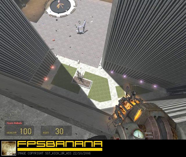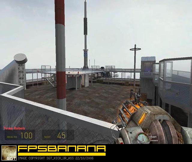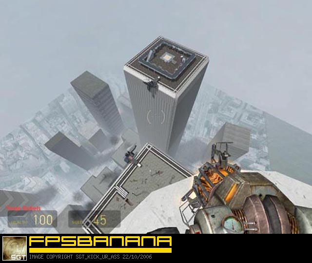 This is my first HL2DM map and my first map since messing around with Quake nearly a decade ago. It's a full-size replica of the WTC towers and surrounding area. There aren't any internal floors, it's just the two tower rooftops, the ground-floor plaza, and the rooftops of some surrounding buildings. I always wanted to visit the WTC but never got to, so this is the next best thing for me. Teleporters take you from the ground to the roofs as well as transport you between towers and among the various lower rooftops. In team-deathmatch, the south tower teleporters will only teleport Combine and the north tower teleporters will only teleport Rebels. Games with less players tend to stick to the tower's rooftops as intended, but there's room to spread out additional play in.