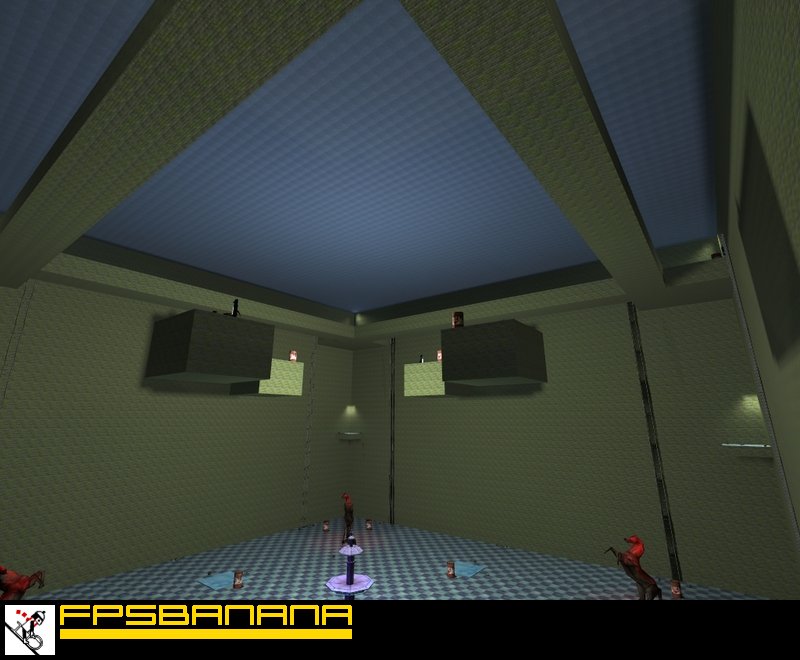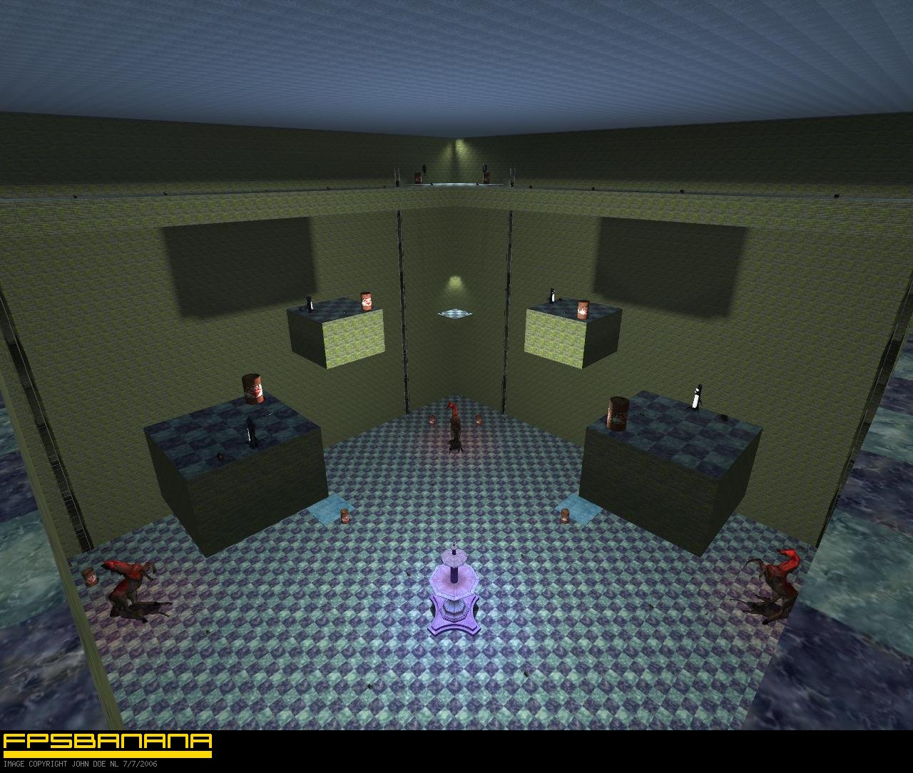 In the corners are transporters to top, 4 elevators and 8 stairs, also to top. Some decoration like horse statues and a fountain.