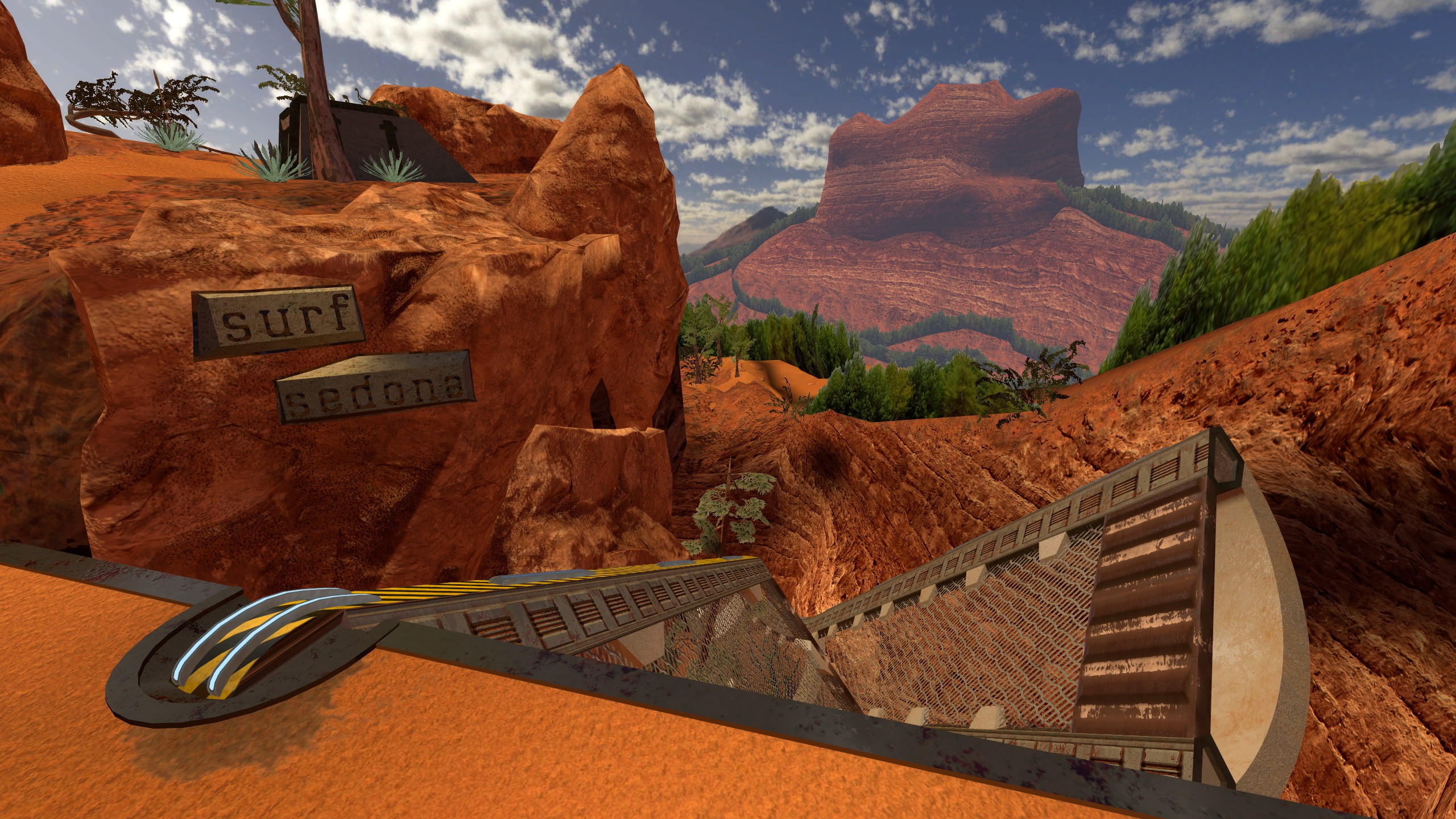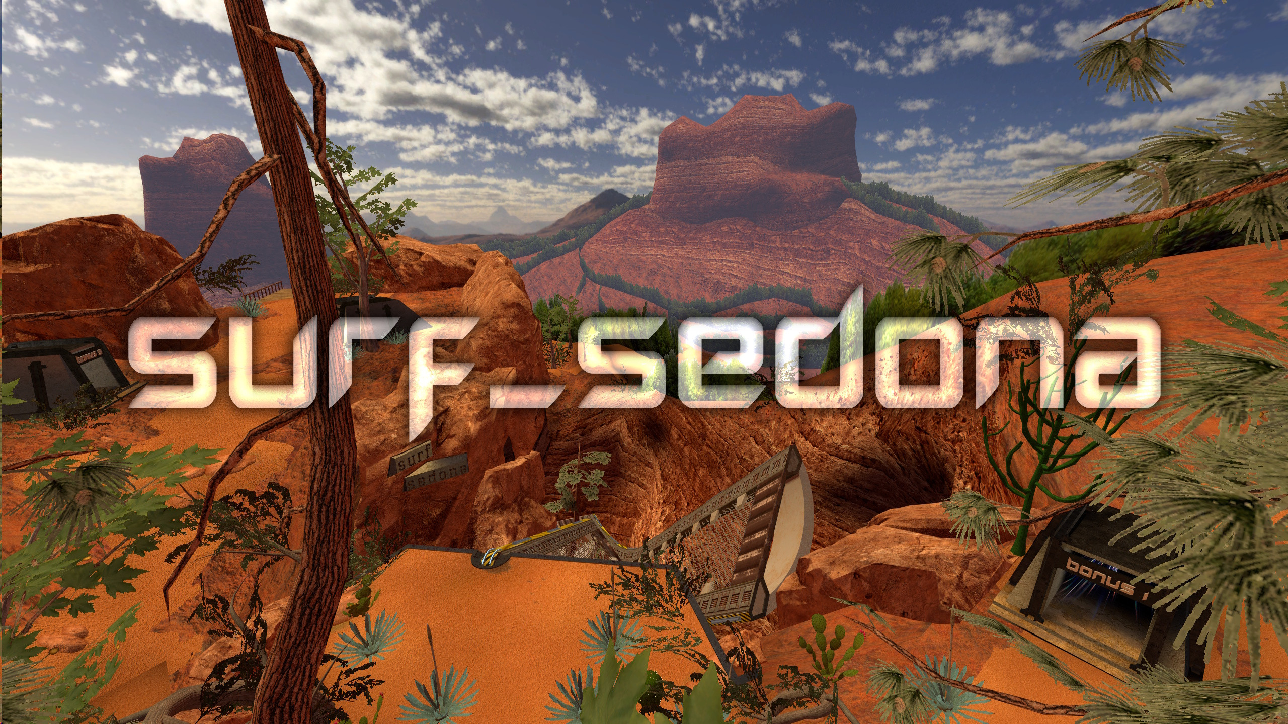 surf_sedona is a T2 linear map set in Sedona Arizona. All models including plants, trees, rocks, and other details were made specifically for this map. There are some shared textures with surf_kepler which I also made.This version of the map is designed for CSS specifically. It doesn't have momentum zones and B10 will not work in momentum. I will be separately working on getting it added natively to that game.Completion time is aorund 1 minute, currernt WR on KSF is 56.4.Development on this map started before surf_kepler which means I've