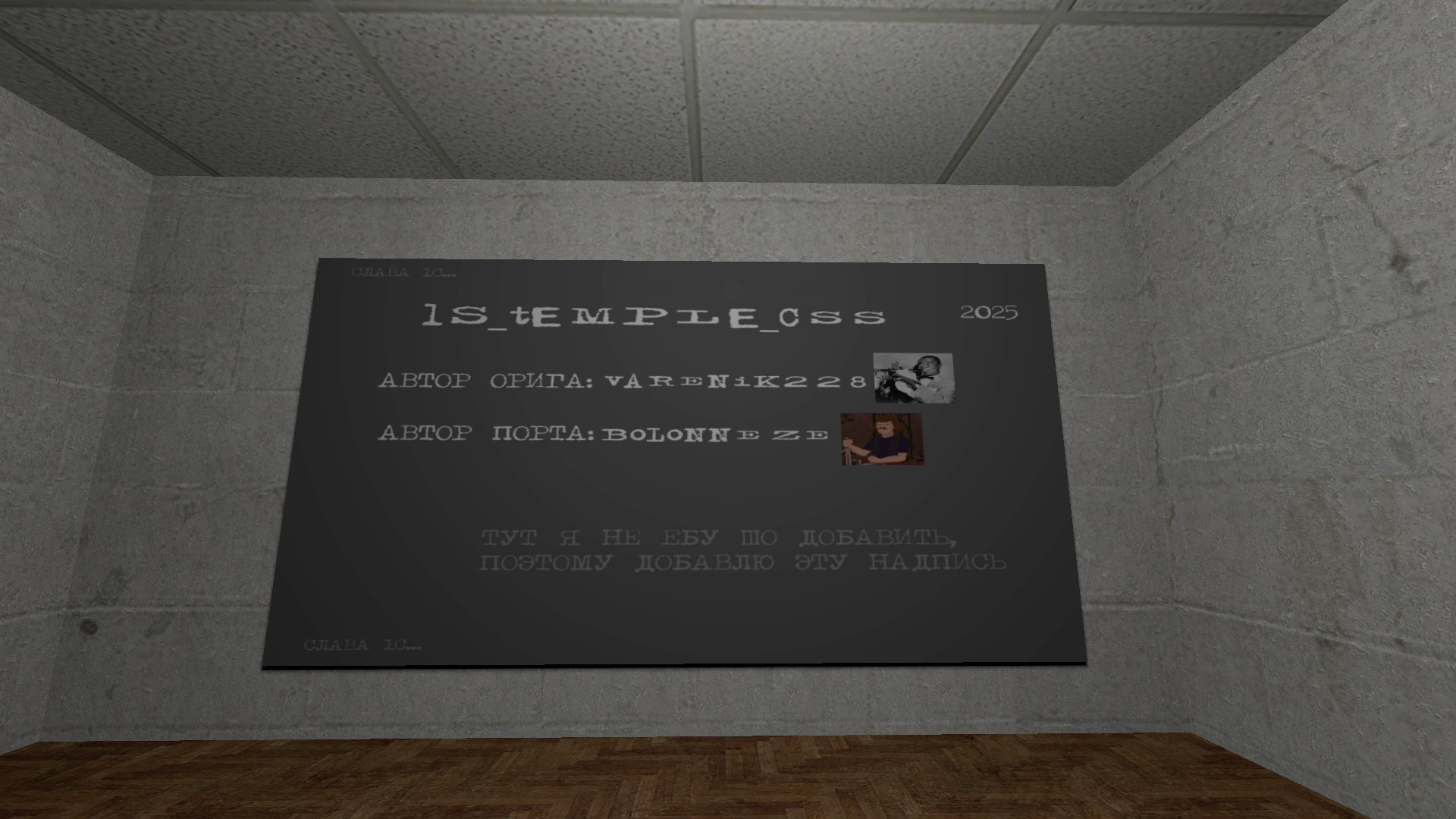 (ru) Порт карты моего друга который ебашил ее для сервера посвященному 1С в CS 1.6. На карте есть: Храм велик 1С База невелик PYTHON Navmesh(en) The port of my friend's map that was created for a server dedicated to 1C in CS 1.6. On the map there is: The temple for velik 1CBase for nevelik PYTHONNavmesh