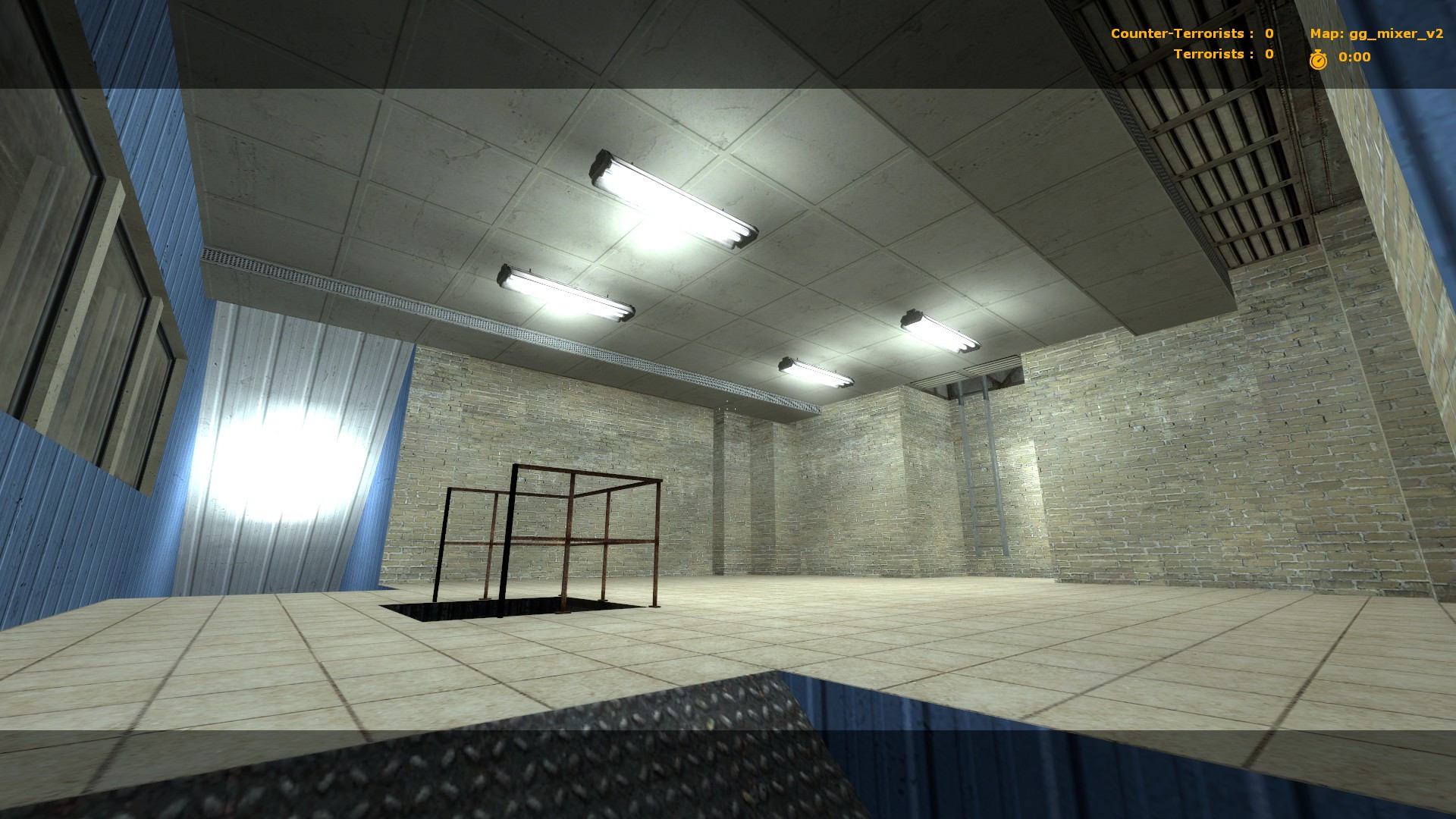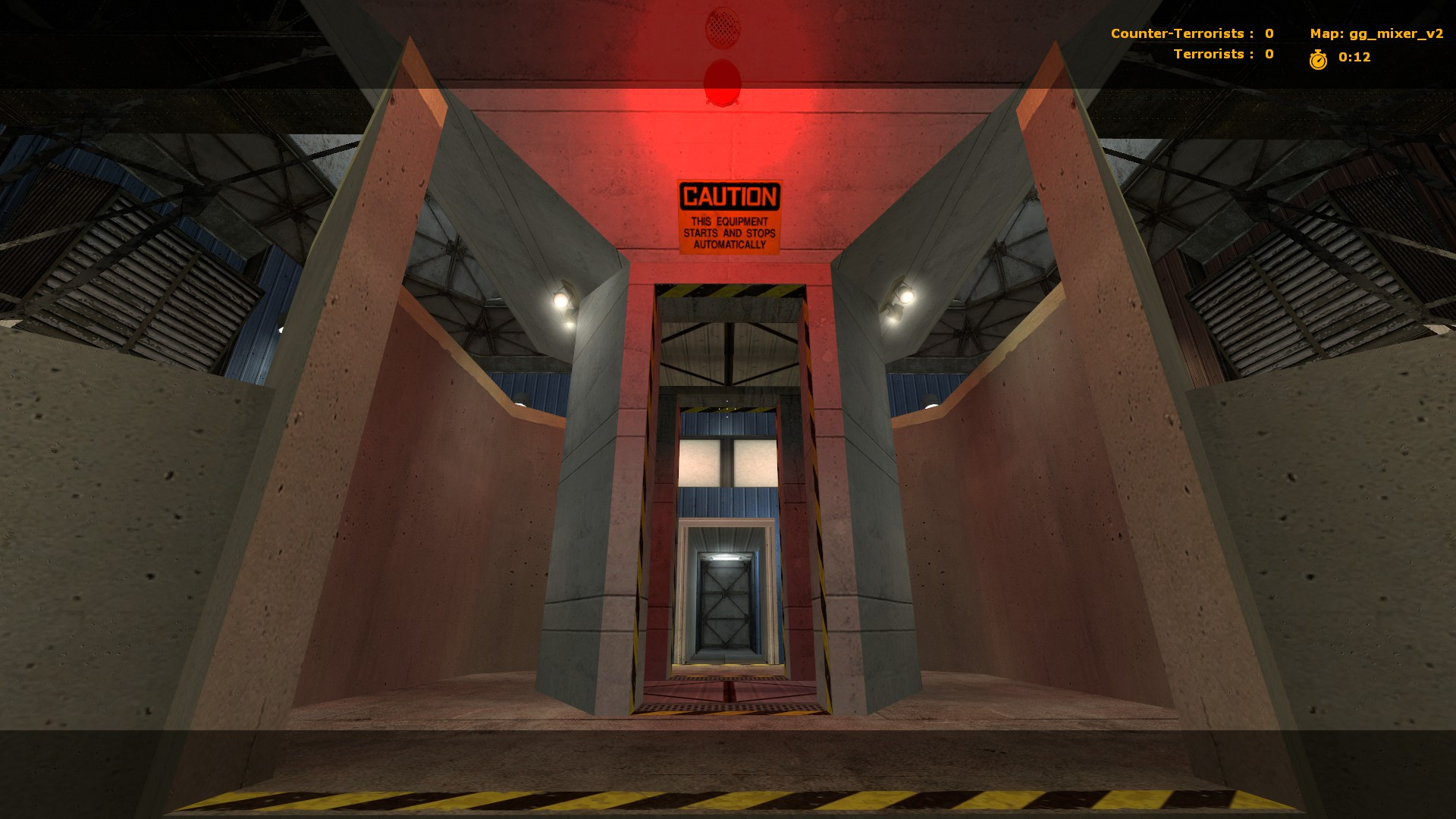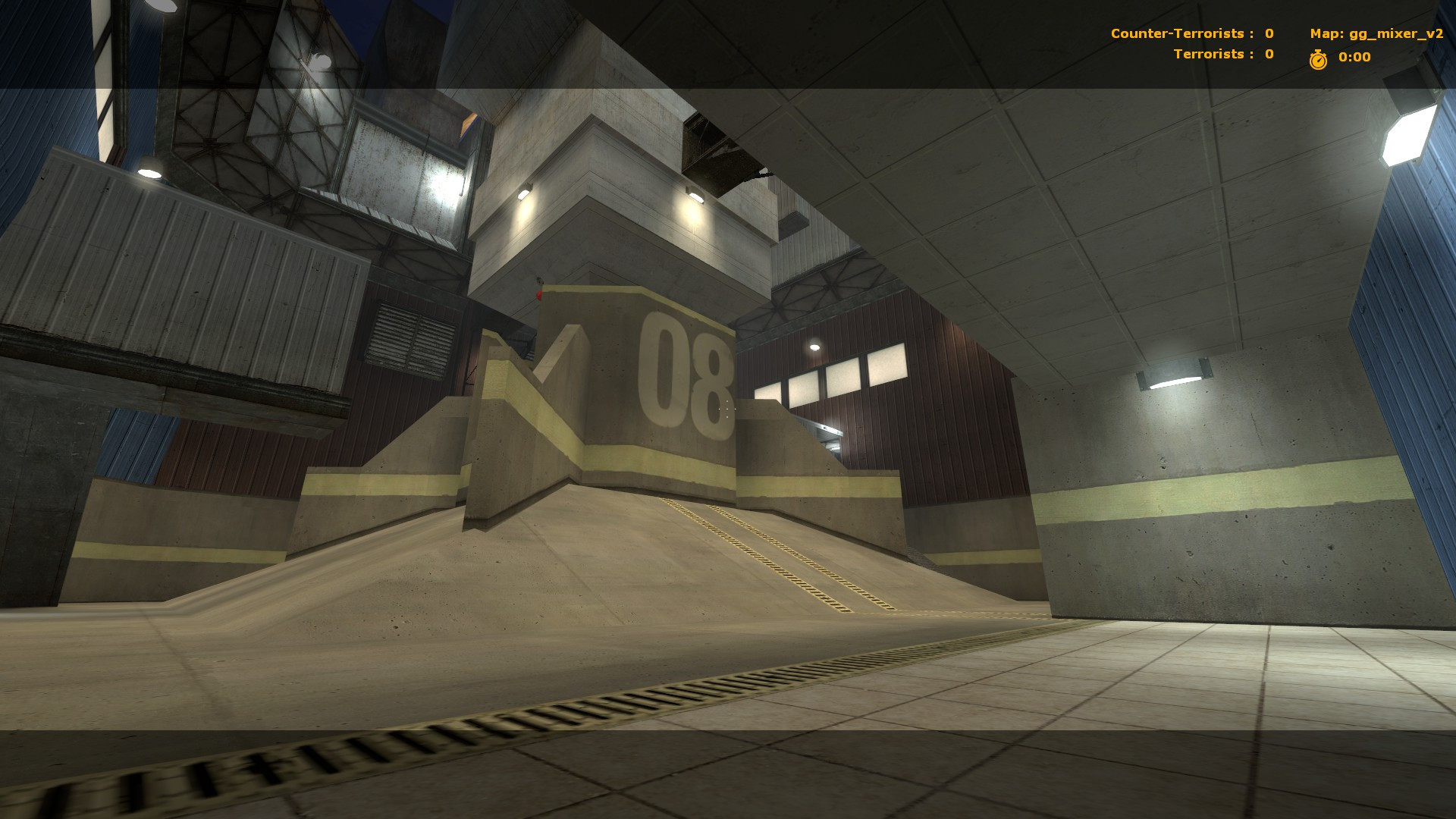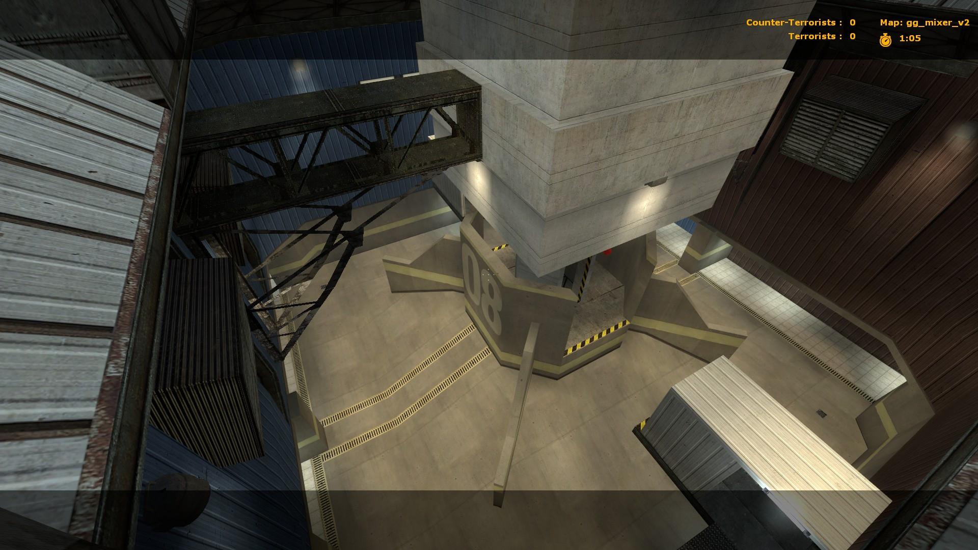 My first Gun Game/CS:S map published! Feedback is appreciatedA very small and simple Gun Game arena with a hazard in the middle - cement falls through a small corridor every thirty or so seconds, crushing anyone beneath it while also blocking the sight line through it. Ledges extending across the top walls of the arena provide more vantage points and means of access to each team's spawn room.No custom textures included - all base game stuff. A .nav mesh is also included for bot support. Also, bots cannot access the upper ledges because they hate ladders I guess >:(