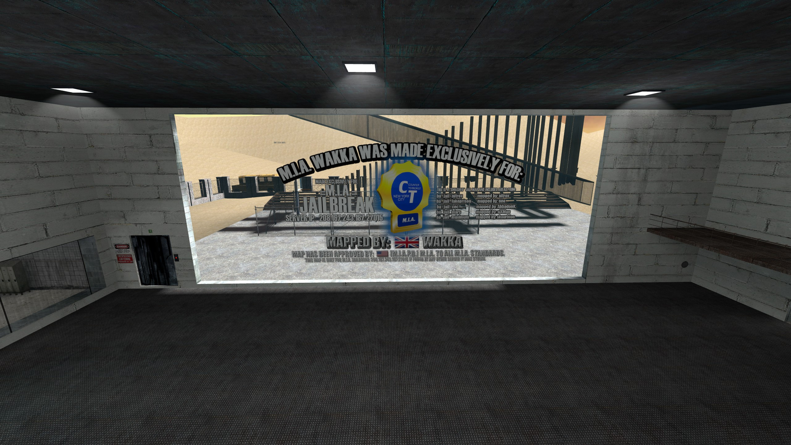 Map from M.I.A. Jailbreak, dated 10/11/2008.This is a beta version of Wakka and is unfortunately the only copy I have of this map from M.I.A. As such, some areas on the map are unfinished. Wakka was created by the M.I.A.P.D. (Senior Admin) Wakka for M.I.A. 24/7 Jailbreak, and is mostly a compilation of several maps, these being:- ba_jail_nitrox- ba_jail_lakeprison- ba_jail_cec- ba_jail_mars- ba_jail_maximum