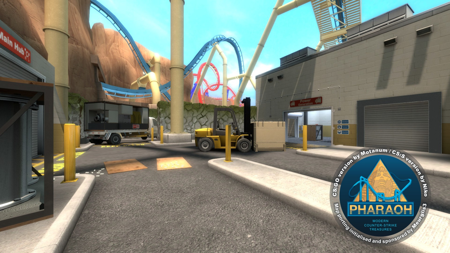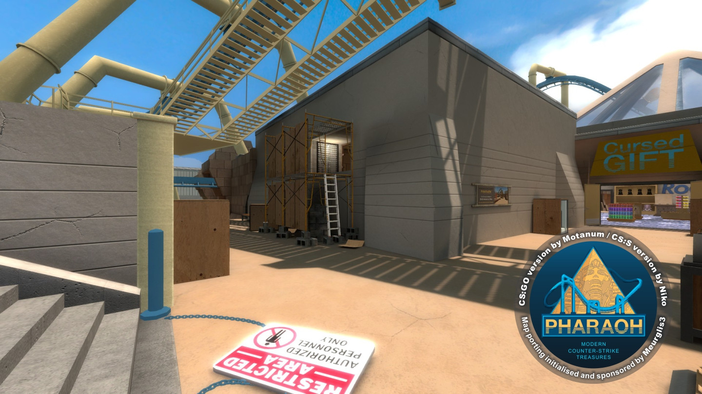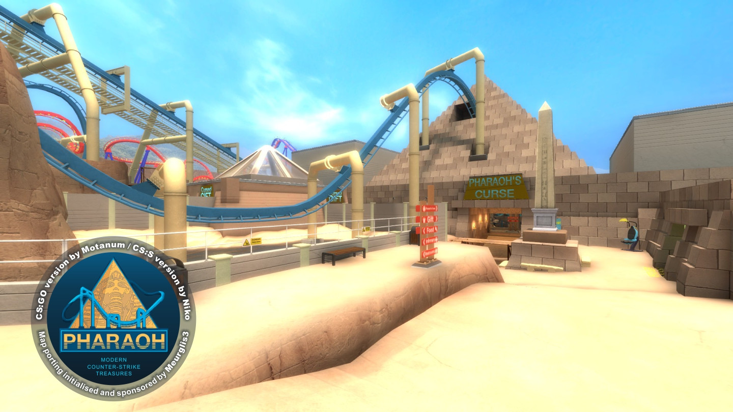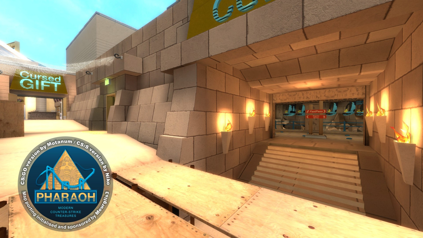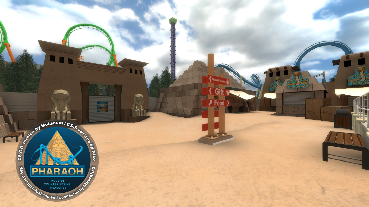 PHARAOHBomb/Defuse Map for Counter-Strike: SourceCS:GO original map creator: MotanumCS:S map port creator: NikoNavigation Mesh editor: Meurglis3High-quality port for CS:S of same-named midsize map from CS:GO by Motanum / Eugenio Roman. Map set on a fictional Egyptian theme park section. This port contains some constructive and visual changes in comparison with the original, which was made for bigger detailing and improvement of the gameplay smoothness.Story: A few weeks from the grand opening of Pharaoh's Curse, the new roller coaster at Roaring Peaks has been picked as the target of the Phoenix Connection.P.S. ~ My name is an erased hieroglyph, my clothes are patched by the wind... :-)