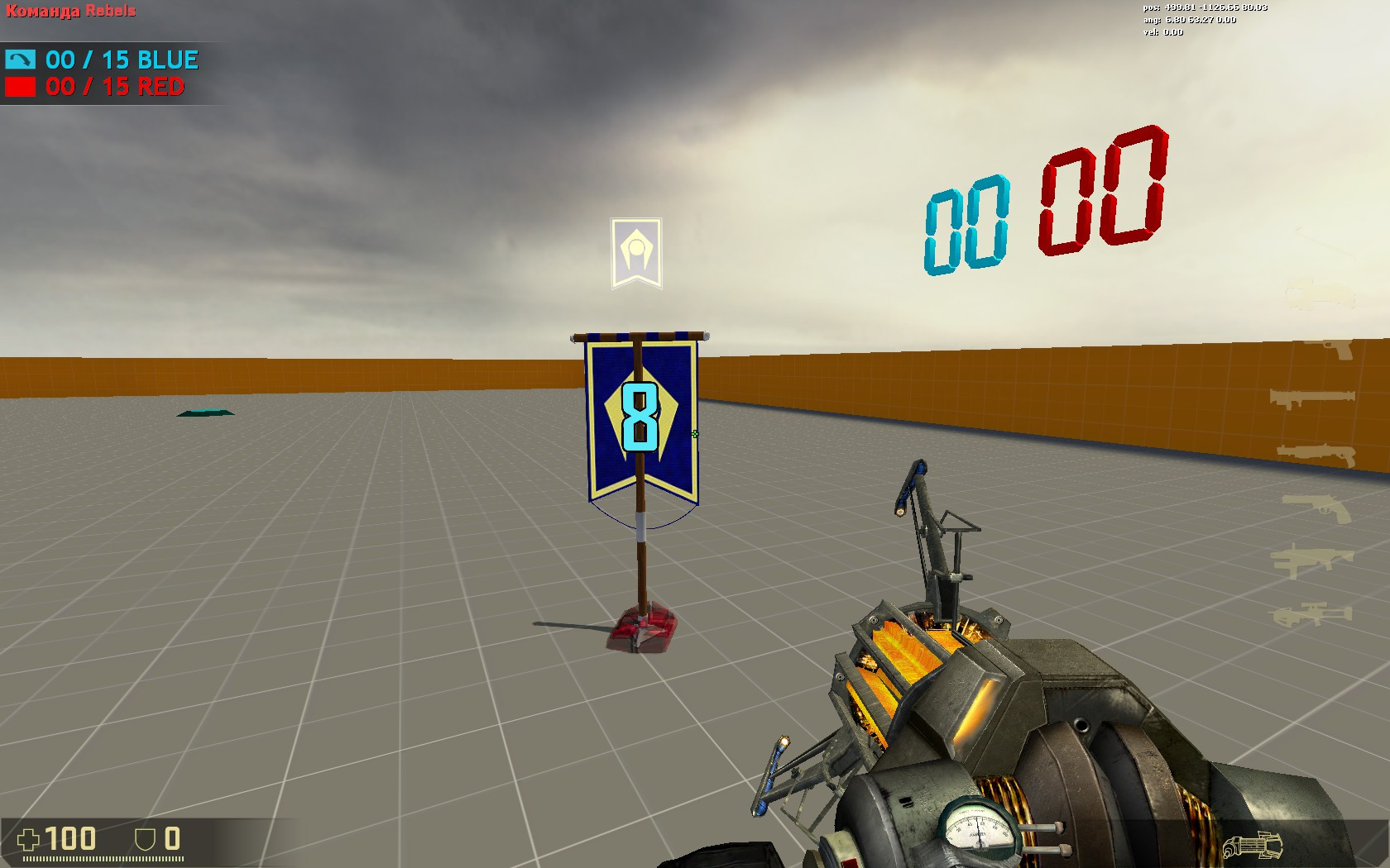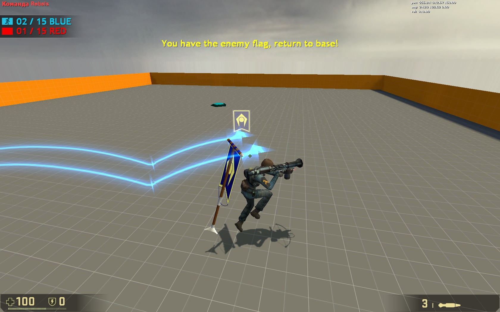 NEW "HL2DM CTF Prefab"!More fun in the old great game with a new CTF mode!Features:- pure i/o valve hammer system (no additional server plugins\scripts needed)- flag is parents on your back like in all CTF games- awesome scoreboard maded from brushes and logic entities- informative "fake-hud" screen elements (score text, flag status indicator)- sounds from Unreal Tournament for each team (flag taken, returned, dropped, scored, etc)- custom physics flag model (no-solid to player and bullets, affected by gravygun, with spritetrail and glowing effects)- through-wall flag indicator (not working through vis-portals :( )- 15 second sprite-timer indicator (shooting on flag will reseting timer)- scoring system +2 points for returning the flag+2 pionts for picking the flag+10 points for capture the flag-2 points for dropping the flag- full screen overlay with "winning" text and random music+ bonus features- Dead players dropping HP kit- Dissolve ragdoll effect for dead players.- Auto Teamplay by gtamike_TSGK http://gamebanana.com/maps/195399NOTES:1) if flag goes outside map(special trigger) or player crashed\disconnected with a flag on his back,flag will respawn in 15 seconds, anyway, so don't worry about it and wait.2) for better hud-elements\text-notifications working, you need to disable all plugins whith uses game_text entities!3) if you used\played previous versions of jora ctf maps and you got game crash or red errors in console sometimes,you need to put Del_cache.cmd file inHalf-Life 2 Deathmatch\hl2mp\custom foldier and run.This operation will clean old sound\models cache which can making in-game confclicts.4) some of content (sounds, models) taken from AG2, UT3 games.5) bugs are possible... please post your feedback if you'll find any.----------------------------------------------------------------------------------------------IN THE LAST VERSION (18 May 2017 update):> new parrenting system (fixing problems, when flag spawns in player orin different dinstance of player back)> new sounds now comes from flag position (before it played everywhere) > earn\lose points for taking\dropping flag> new text notifications "You've drop the flag""You returned the flag""You have the enemy flag"----------------------------------------------------------------------------------------------[!] (we are russians, so if you find any grammatical errors inthis description or game_text entities, please, feedback and we will fix all stuff for better undertanding) ----------------------------------------------------------------------------------------------INSTRUCTION (HOW TO USE):put "_flag" foldier in yourHalf-Life 2 Deathmatch\hl2mp\models\custom foldiercopy-paste groupped entities (both flags, scoreboard, mixed enities from center... and dont forget about three big trigger_multiple's covered all the map).IF YOU WANT TO ROTATE FLAG, you should change angles in env_entity_maker entity namedblue_flag_maker_phys or red_flag_maker_phys ...SCREENSHOT:WARNING: Dont rotate flag groups in hammer ! You will broke everything!