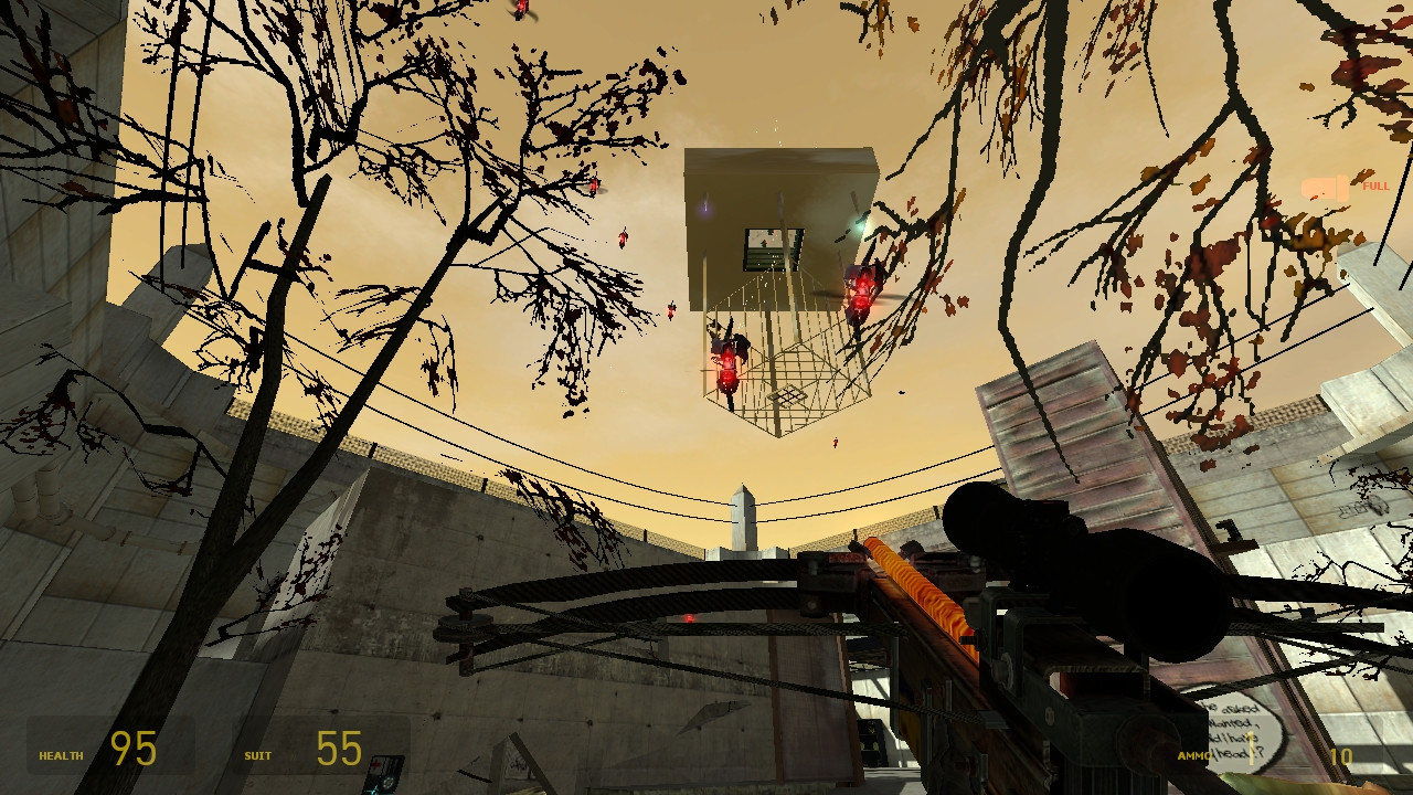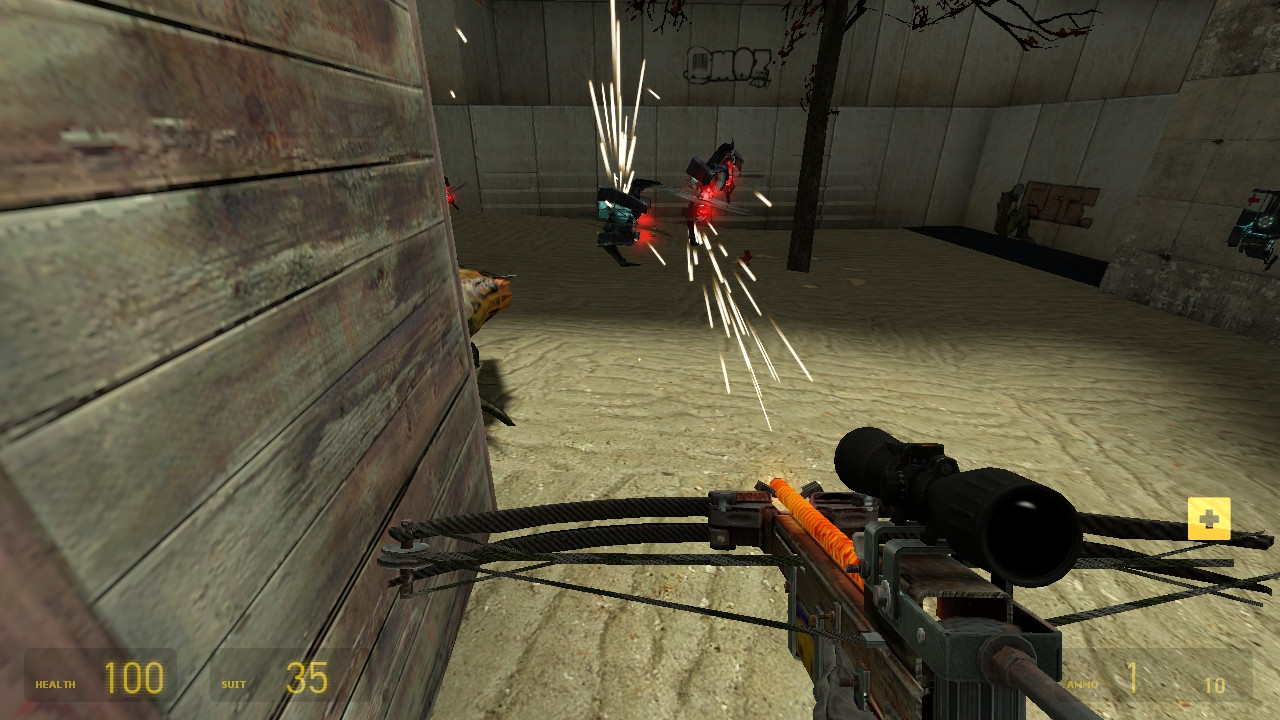 Deathmatch gameplay for 2+ players.Use the button to summon swarms of zombies or antlions during battle. Manhacks anyone?Lots of secrets to discover in this fast paced arena!Made by Pseudonym`