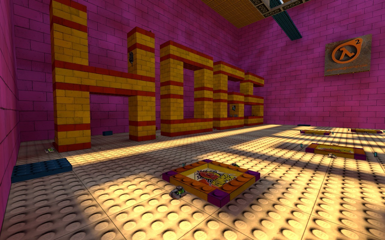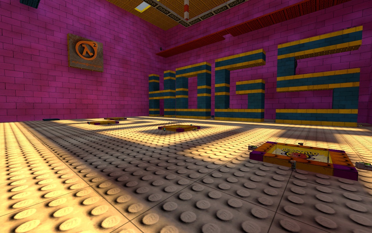 As requested I made a smaller version of dm_hogs_lego_logo, faster and playable even in a few players, with normal gravity. I added 2 teleporters in the maze and slightly increased the time to descend into the labyrinth.