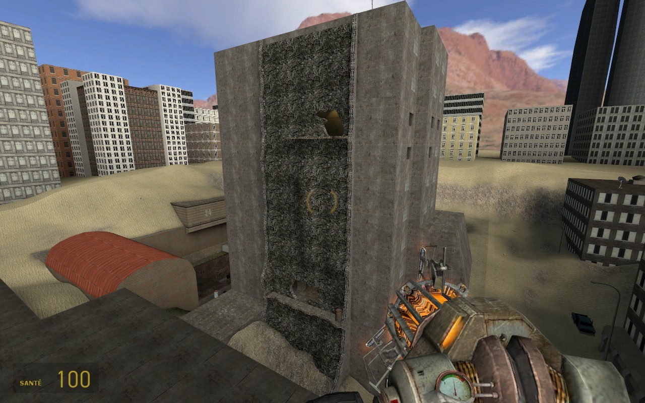 cette map ce situe dans une ville inspiré d'un niveau du jeux la planète des singe. la façade écroulé de l'immeuble central contiens une échèle