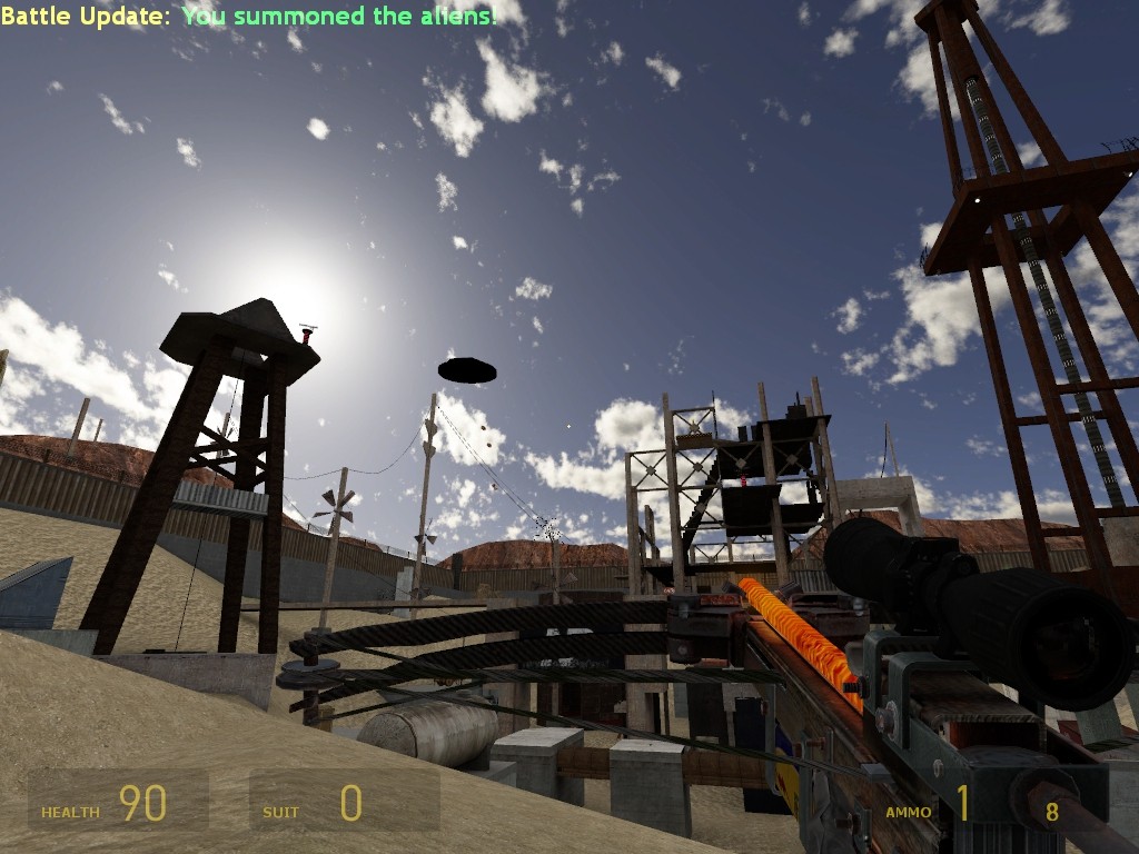 About & Download link:Deathmatch gameplay for 2+ players.In the desert on an oil field near area 51.Map powerups: (touch to activate)- 20 sec invincibility powerup.- Summon a UFO to drop bombs on the enemy.- Carry a blue ball to run extra fast.- Jump boots when worn will remove fall damage.- Activate beacons to open the RPG puzzle.Made by Pseudonym`