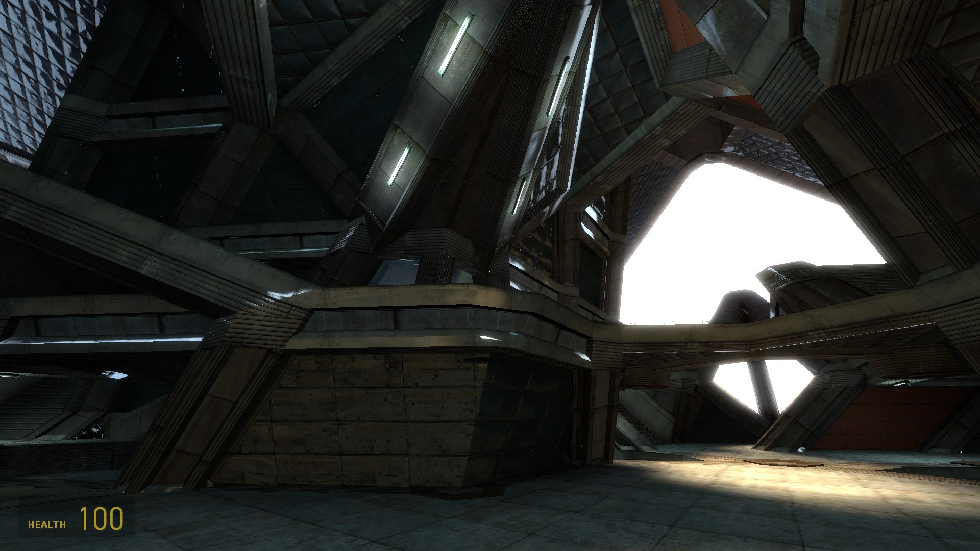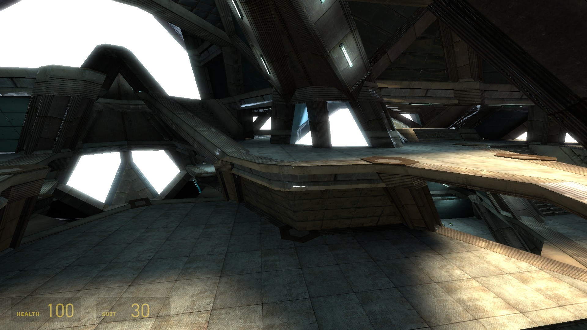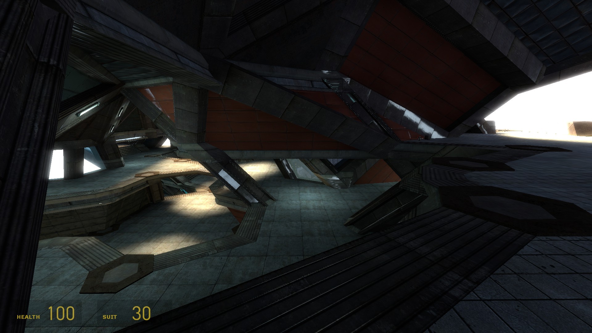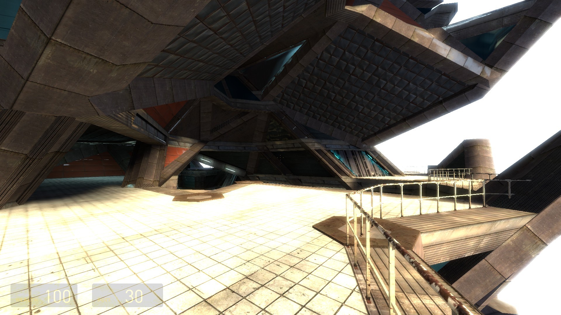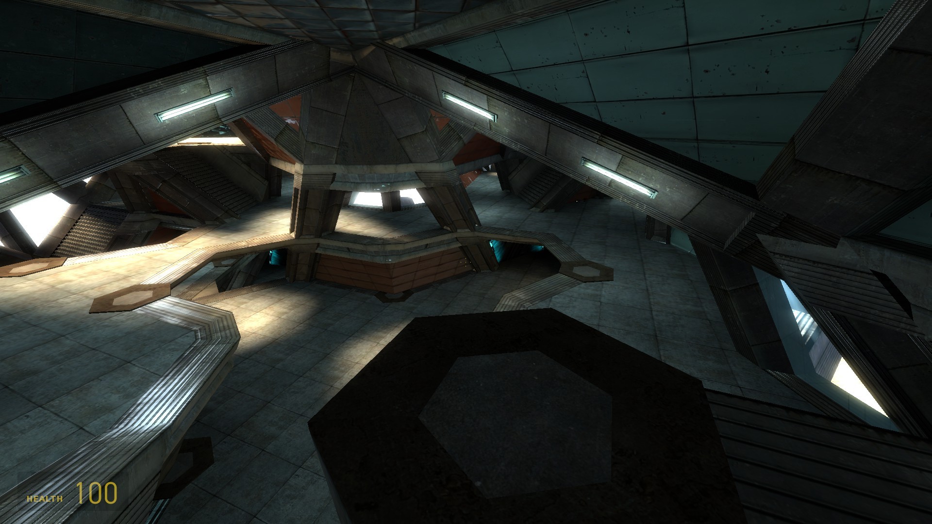 In practice this is obviously not possible. I created a single set of 3 floors and connected the bottom and top with teleporters. This is the only practical way to make a working map based on the idea. Unfortunately the illusion of a continuous space is mostly destroyed by the teleporters. I wish I had real portals (as in the game 'Portal') to connect the floors. With those the idea would work much, much better. Alas, there is no way to get portals to work in Half-life 2 multiplayer. It's a different version of the source engine. So I have to live with the 'simple' teleporters. I hope basic idea still becomes apparent when you play the map. Another unique element in the map is the architecture. Unlike most maps it was not build on the editors basic grid that creates a lot of 90 degree angles. Instead I used a 'fake' grid with a 60 degree angle between the x and y axis. That allowed me to create a hexagonal layout for the tower.