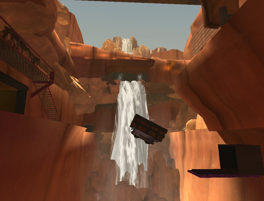 Goal: Blue has to get the full gold cart at the bottom of the canyon to their waiting getaway dump truck. Red has to stop them.