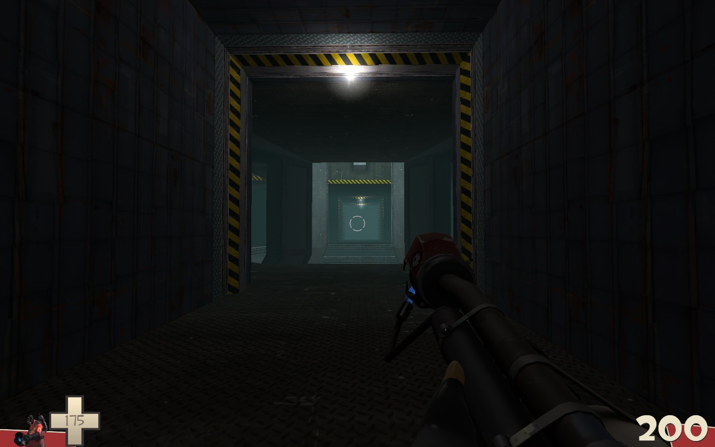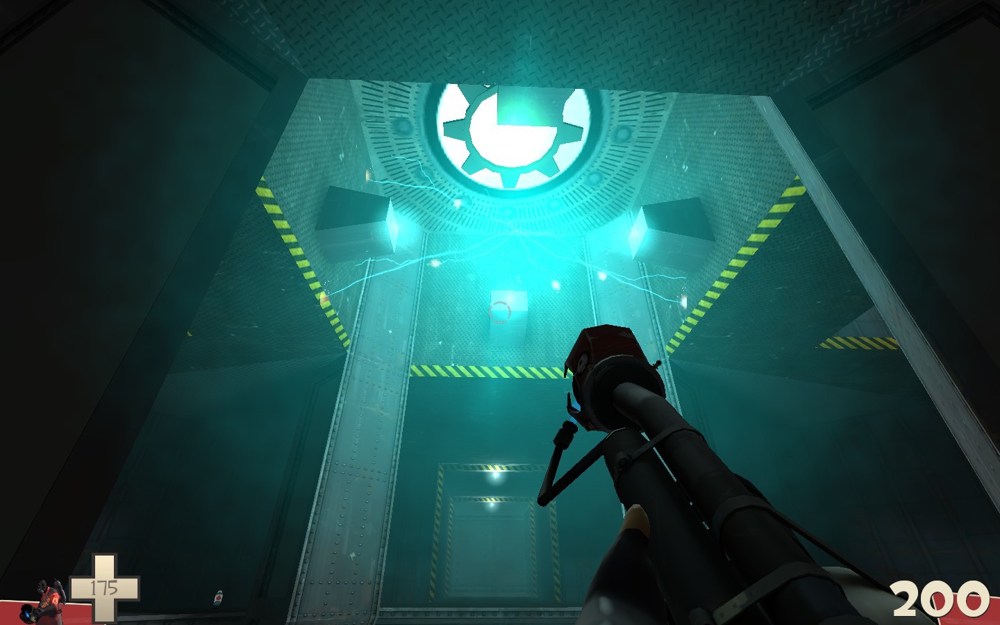 Fractal has a similar layout to Morbias, although it is smaller. In the center, full health and ammo pickups may be found - but beware, if one of the four glowing buttons is shot the floor beneath these goodies will open up and teleport you straight into the energizer at the top of the chamber, leaving your gibs flying all over the map.