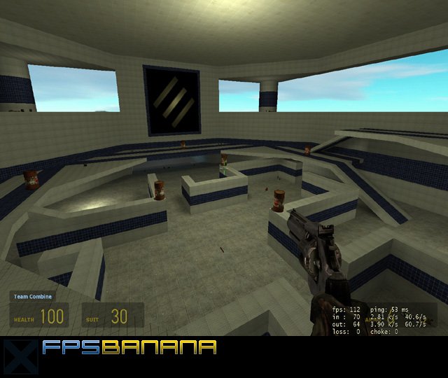 Game area was expanded by opening up the higher area (images A and B; B is taken from there). Ladders were replaced by ramps and the teleport entires equipped with high speed push pads so you really shoot through them. Oil drums spawn every 3 minutes. This map gets really intense and is good for duels.