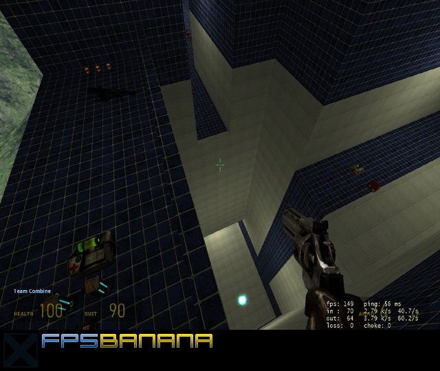 This is a remake of the classic dm_magnum by top map designer {gdwg}MooseD. I found the map to contain too much health and suit, so I began by reducing those a bit. One thing led to another and soon water had been added to the far side of the map to prevent fall damage and introduce xbow sniping (image E), shotguns were added, 3 smg nades and a hidden area (hidden from sight, not a secret room) where the ar2 and orbs can be found (image D). The way to get there is to use smg nades, so going for the orbs will cause loss of health.