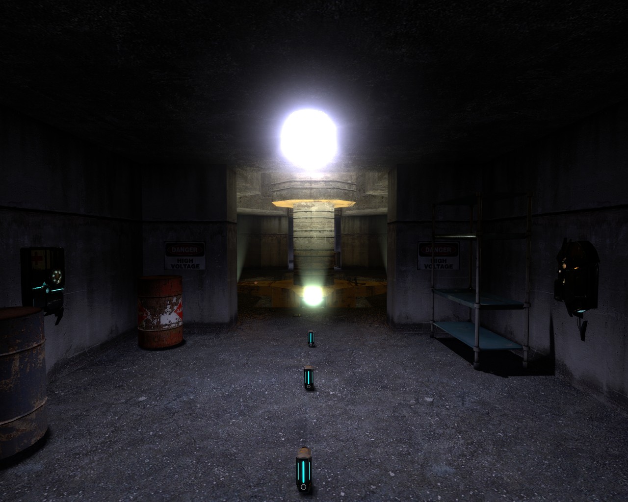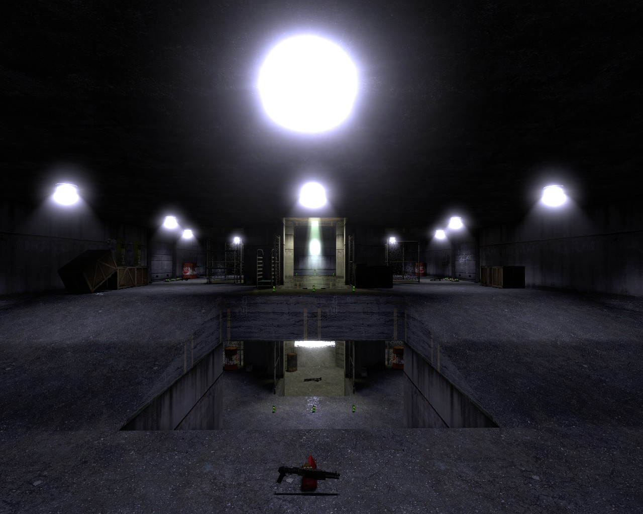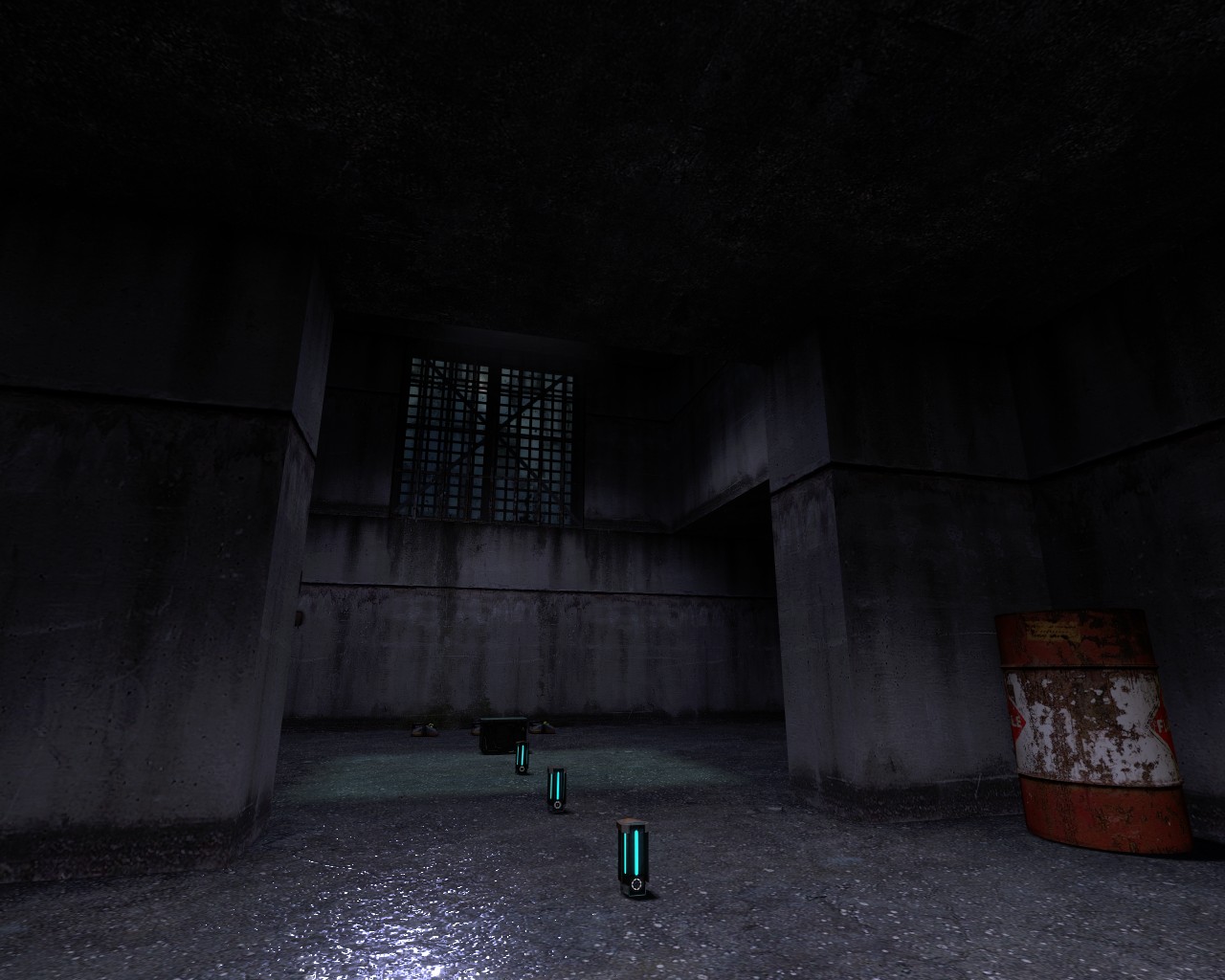 Strange rusting machines dominate the center of this concrete labyrinth.